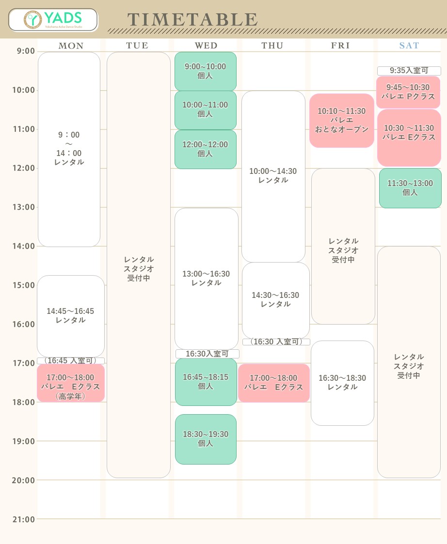最新タイムテーブル ご予約・お問い合わせ・体験レッスンのお申し込みはこちら カレンダー クラス案内 当スタジオは少人数レッスン制となっております。 現在、ご案内しているクラスは以下の通りです。 クラス名をクリックしていただきますと、レッスン内容をご覧いただくことができます。 また、見学や体験レッスンも随時受け付けておりますので、お気軽にお問い合わせください。 クラシックバレエ Pクラス 対象:3歳〜 体幹のトレーニングを遊びや演劇的要素を入れて行います。クラシックバレエの前段階としてステップの習得、柔軟性とリズム感を伸ばします。 身体と心の両面の発達を促しながら、それぞれのお子様にとっての踊る楽しさを見つけ、人前での発表を通して自信を身につけます。 ︎Eクラス 対象:6歳〜 ストレッチとトレーニングを通してクラシックバレエに必要な力を身につけます。 バーレッスンを行い、バレエの基礎を定着させ、人前で音楽や役柄を表現できるように導きます。 発表会を通してプレゼンテーション力や協調性も養います。 ︎︎Sクラス 対象:小学5年生頃〜 クラシックバレエの基礎、より高度な技術の習得を目指します。回転やジャンプを含むアンシェヌマンを学び、柔軟性や筋力を伸ばします。 一定の期間お稽古を継続した生徒さん(希望者)には、日本バレエ協会バレエ修業認定証授与テストおよび認定を行います。 オープンクラス 対象:中学生~ バレエの経験の全くない初心者の方やブランクがある方にご参加いただけるクラスです。フランス語のバレエ用語も混じえながら、パ(動き)やアンシェヌマン(動きのコンビネーション)を覚えていきます。 怪我なく踊りを楽しむため、美しく踊るための身体の使い方の基礎を学び定着させます。 その他のクラス コンテンポラリージャズ 始めにウォーミングアップを行います。コンテンポラリーダンスやジャズダンスのクラスフロアやアイソレーションを習得しながら、最後にはJ-POPや洋楽などに合わせた振付を踊ります。 技術力だけでなく、音楽性や表現力も高めていきます。 ミュージカルダンス ウォーミングアップ、アイソレーション、フロアでのストレッチや腹背筋、体幹トレーニングを含みます。 ジャズダンス・シアターダンスの基本のステップ、ターンの練習・最後にはミュージカルナンバーに合わせて振付を踊ります。クラスでは2、3週ごとに新たな振付にチャレンジします。 自分らしさや強みを探しながら、踊りの中にストーリー性をもって、表現していくことを目指します。 フラダンス ハワイの伝統や文化含むフラダンスの基礎を一から学べるクラスです。 フラを通じて、自然や周りの世界への敬意や感謝の気持ちを深め、クラスでは曲や歌詞の意味を理解しながら丁寧に踊ります。 ゆったりと身体を動かしますので、美容と健康にもおすすめです。 HIPHOP 全くの初心者向けの入門クラスです。 ストレッチを通して身体を柔らかくでき、リズム感も身につけられます。 不定期で開講しております。 ピラティス 少人数で行うマットピラティスの入門クラスです。固まった筋肉をほぐして歪みを整えます。深層筋を鍛えることで、代謝の向上、シェイプアップにも効果的です。 クラス情報 通常クラス情報はこちらをご覧ください。